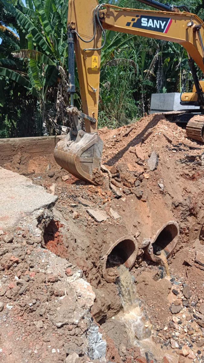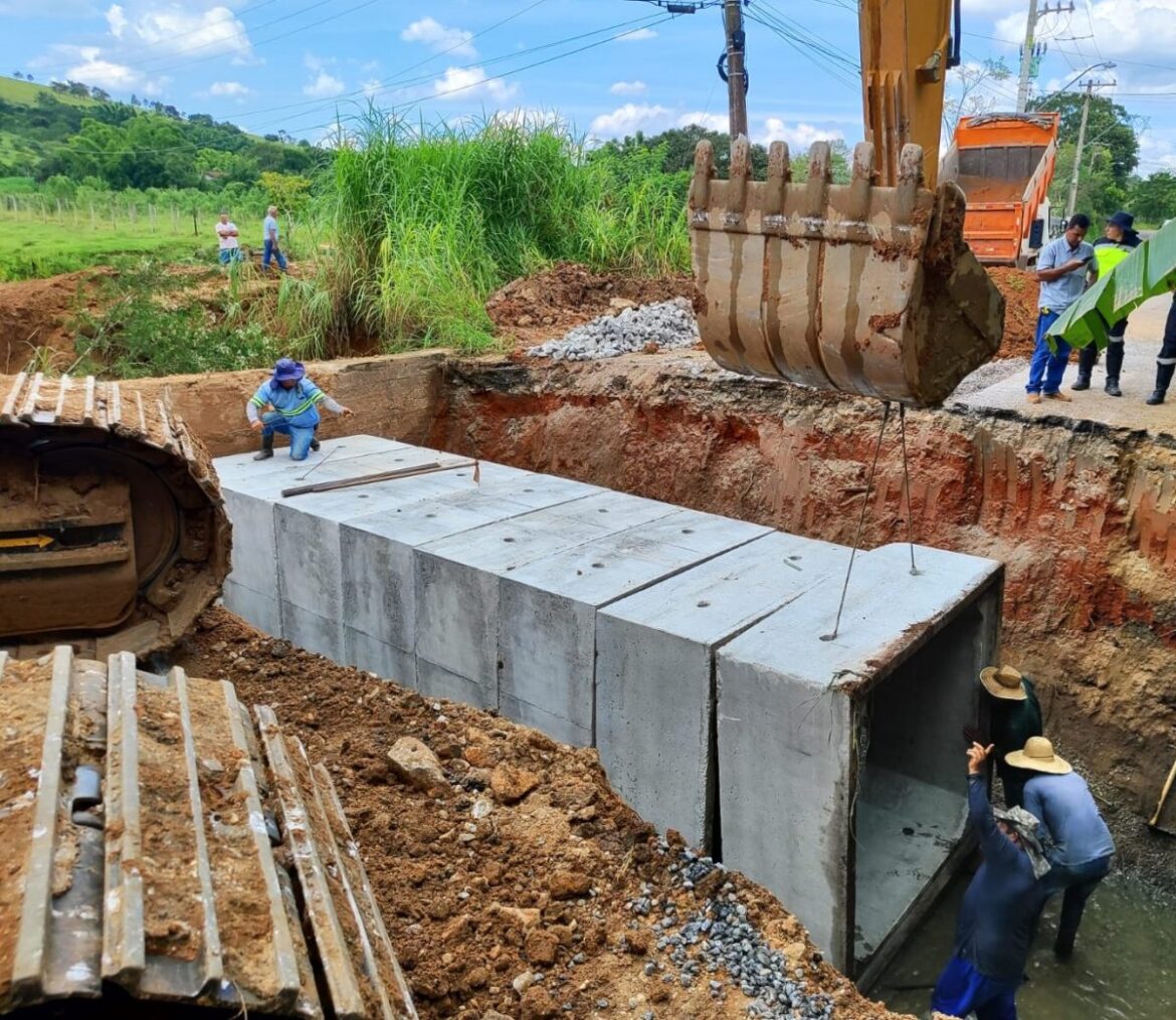 No local estão sendo instaladas aduelas de concreto, medindo 2x2m, em substituição aos tubos com 1,20m de diâmetro, a fim de aumentar a vazão do córrego e a segurança viária da via.