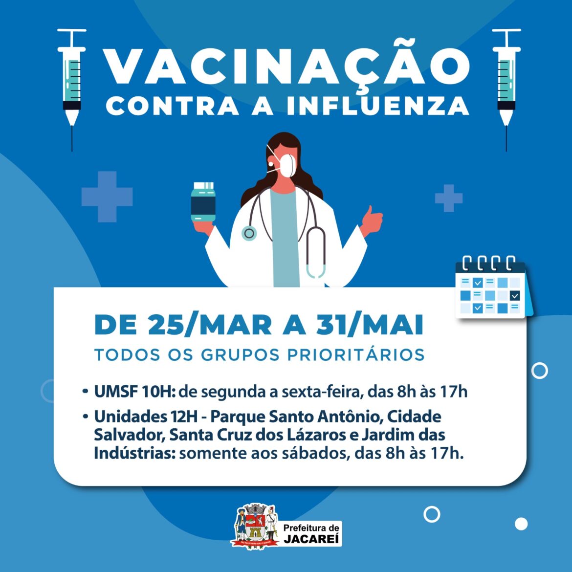 A Prefeitura de Jacareí, por meio da Secretaria de Saúde, informa que a Campanha Nacional de Vacinação contra o vírus da Influenza em Jacareí será realizada no período de 25 de março a 31 de maio, podendo ser prorrogada caso não seja atingida a meta de vacinação de 90% dos grupos prioritários no município.