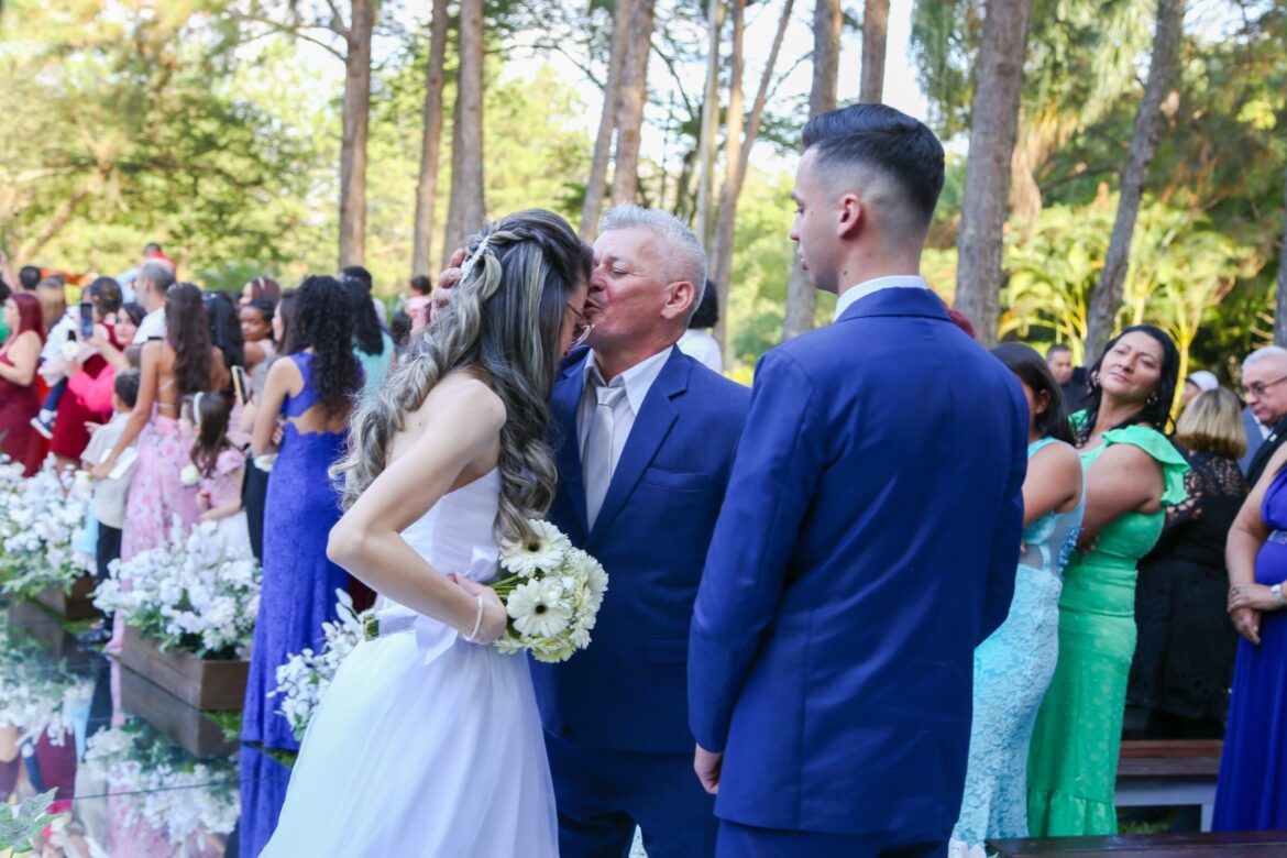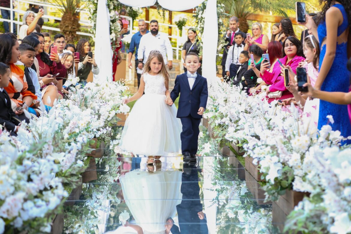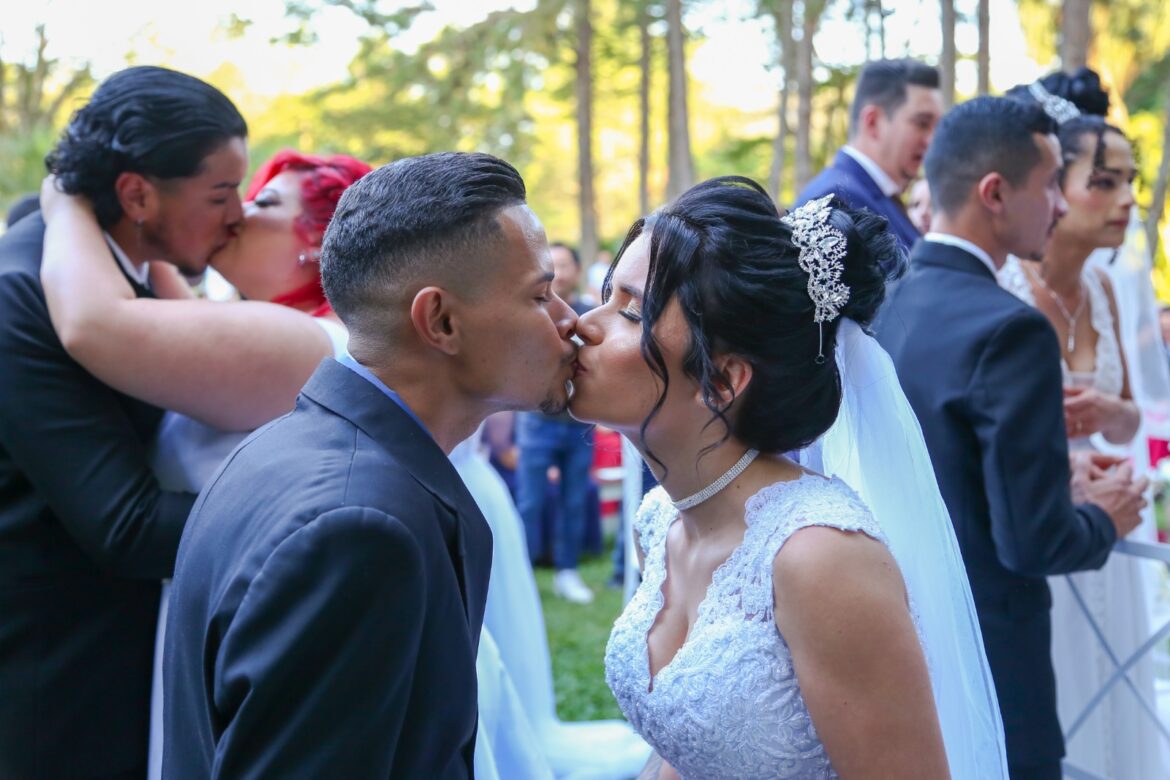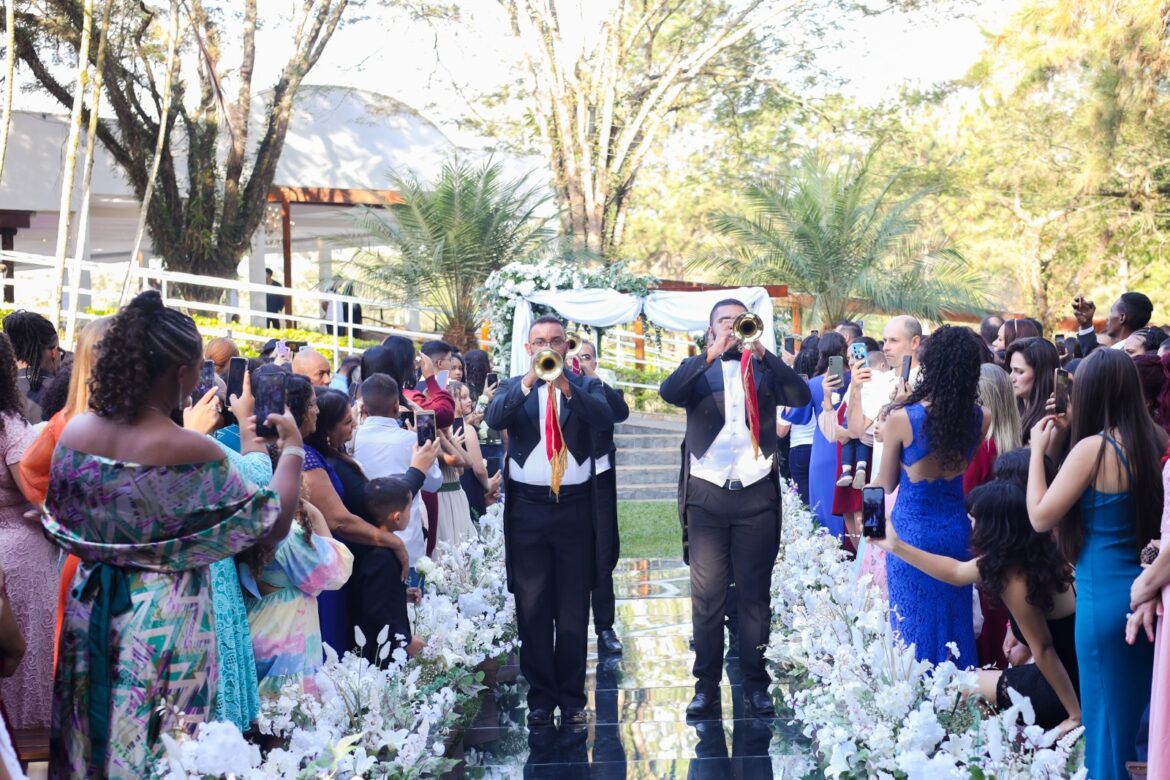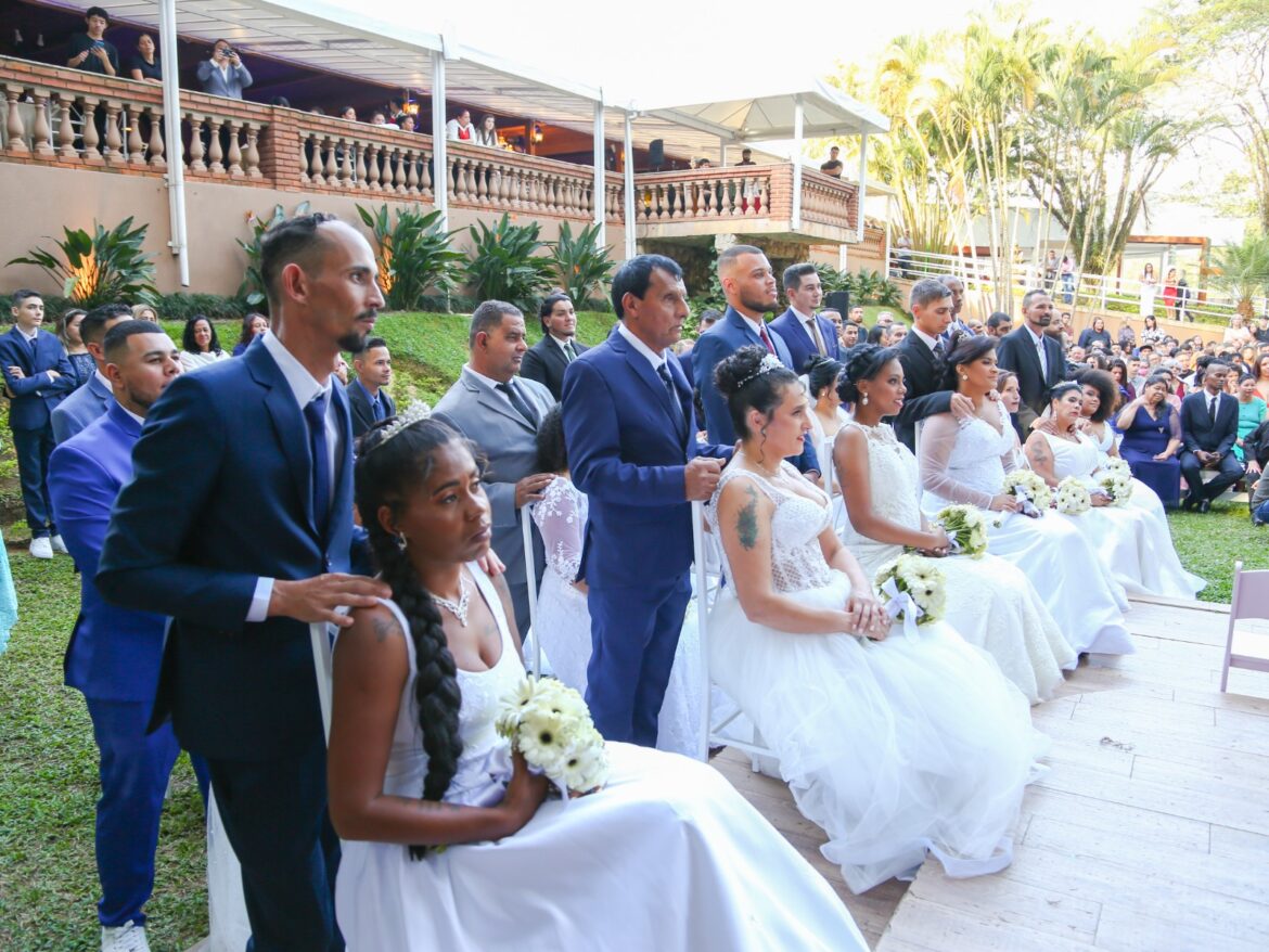Realização da Cerimônia: A cerimônia, presenciada por cerca de 500 pessoas, foi conduzida pelo Juiz de Paz, Claudinei Teixeira, ao lado do Padre Osmar dos Santos e do Pastor Rogério de Jesus. Todo o evento teve a trilha musical conduzida pela banda ‘Central dos Músicos’, com participação especial do quarteto de Clarins da Orquestra Sinfônica de Mogi das Cruzes para entoar a Marcha Nupcial, enquanto as noivas passavam por debaixo do arco de flores brancas, andando na passarela de espelhos. Após a troca de alianças e o aguardado “Sim”, os casais receberam as certidões de casamento civil e os noivos e noivas, bem como padrinhos, madrinhas e convidados foram conduzidos para o jantar. A celebração contou ainda com um show da cantora Silvana Cardoso.