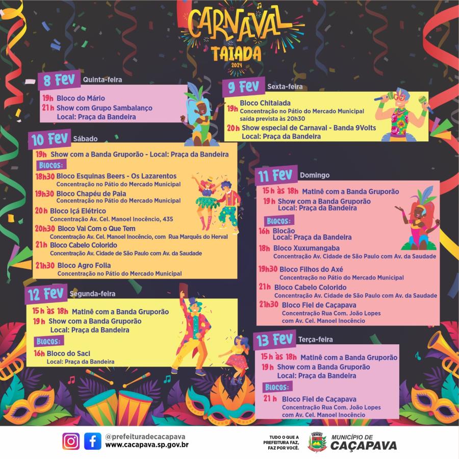 Os desfiles e apresentações de blocos seguem até terça-feira, dia 13, com atrações para todos os gostos. O Carnaval de Caçapava é realizado pela Prefeitura, por meio da Secretaria de Cultura e Turismo. Veja abaixo a programação completa.