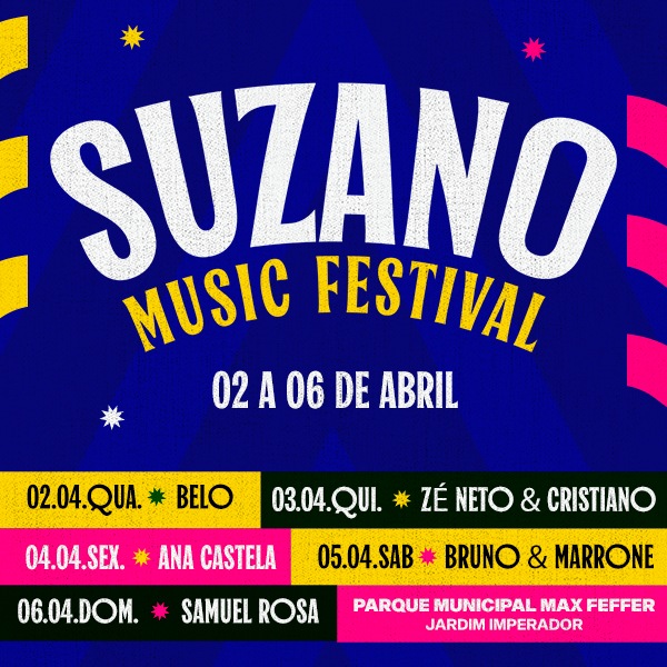 O Suzano Music Festival 2025, evento em comemoração aos 76 anos de Suzano, promete agitar a cidade com grandes nomes da música brasileira. A festa acontece entre os dias 02 e 06 de abril de 2025, no Parque Max Feffer, e conta com shows de artistas como Belo, Zé Neto & Cristiano, Ana Castela, Bruno & Marrone e Samuel Rosa.