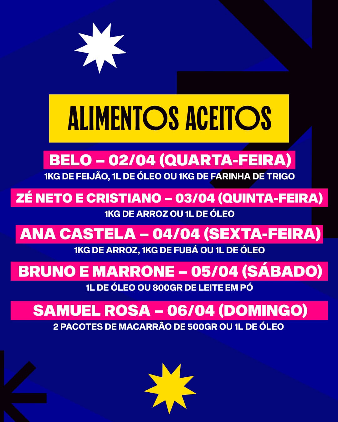 Os ingressos podem ser adquiridos por meio da troca solidária de alimentos em pontos autorizados ou pela compra de ingressos VIP para quem deseja uma experiência exclusiva.